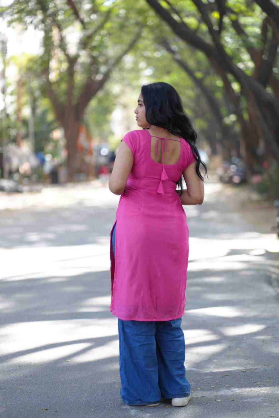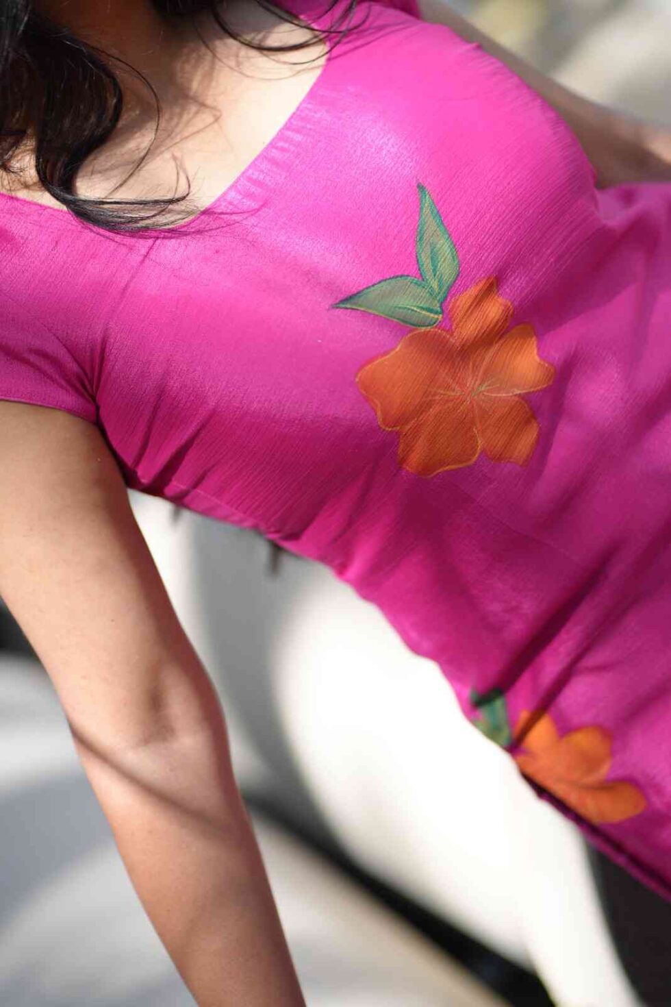 This rani pink straight kurti features beautiful orange flowers, reminder of our beautiful south Indian colors! Soft rounded square necklines both in the front and the back are tailored for all types of faces and bodies! The neck line in the back comes with long tassels. The top comes with a cotton lining.