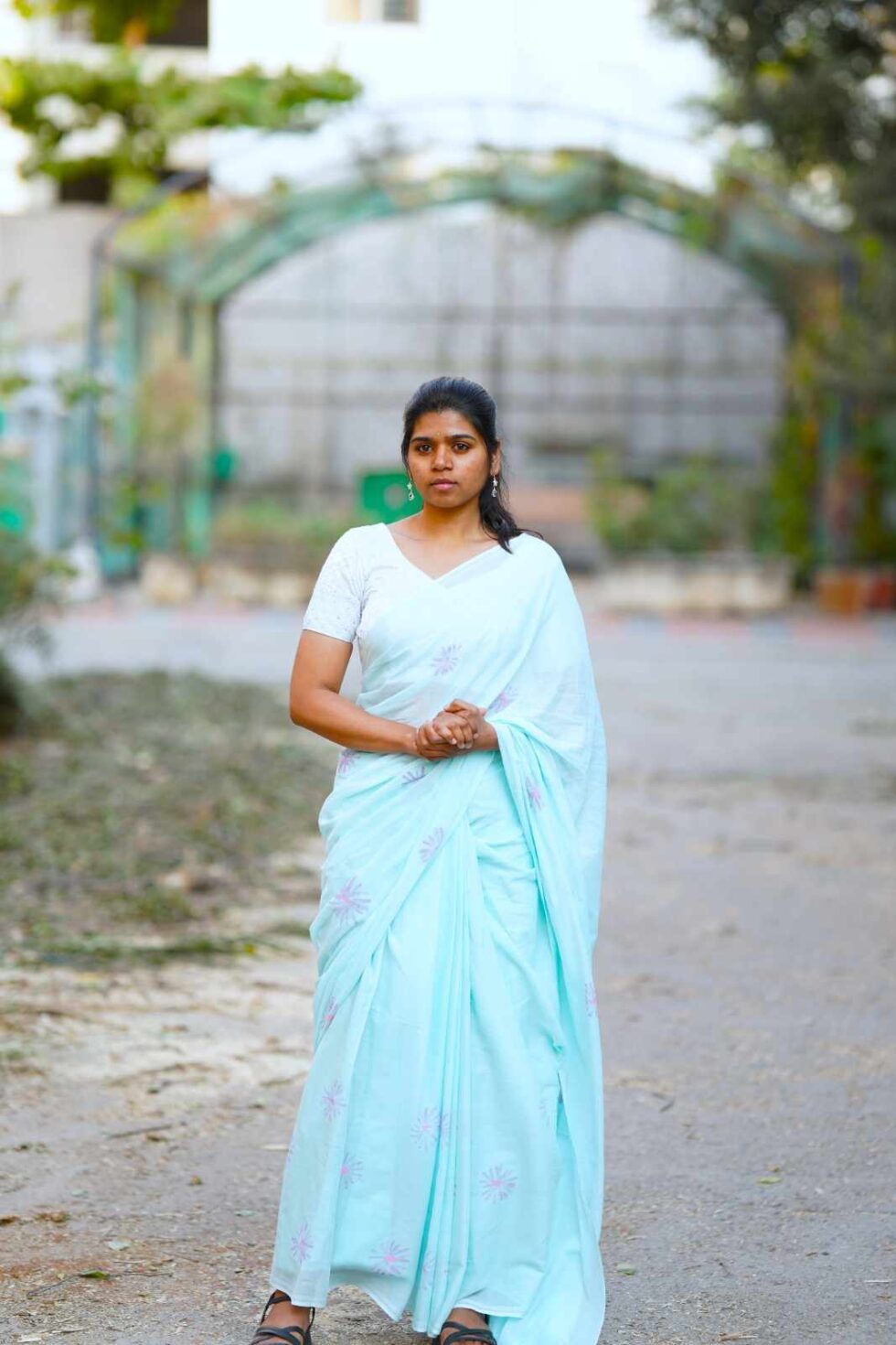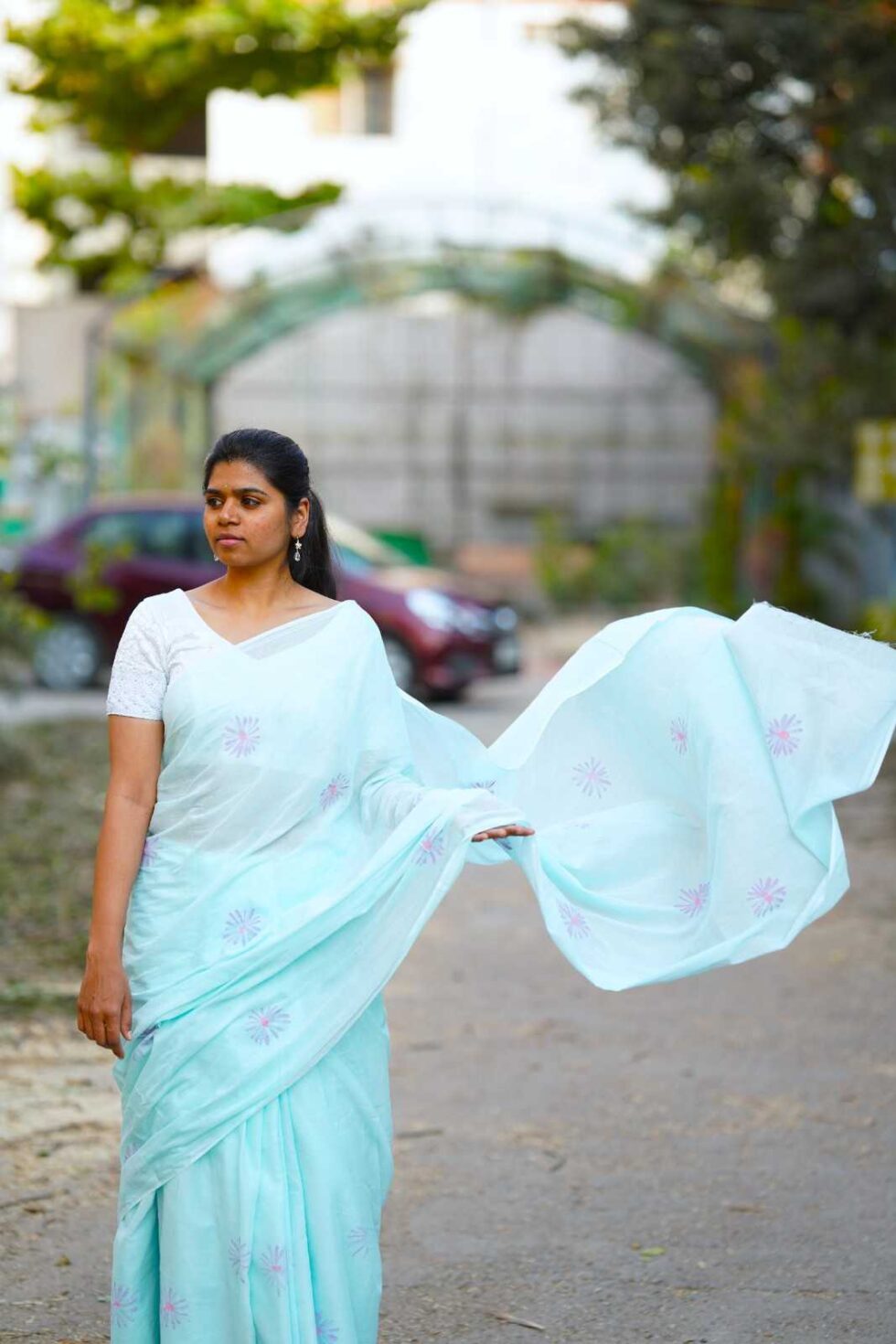 This super soft mul cotton saree features subtle flowers in pastel violet & pink. Perfect to keep your body cool for long summer days.