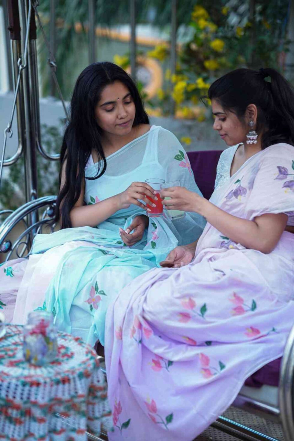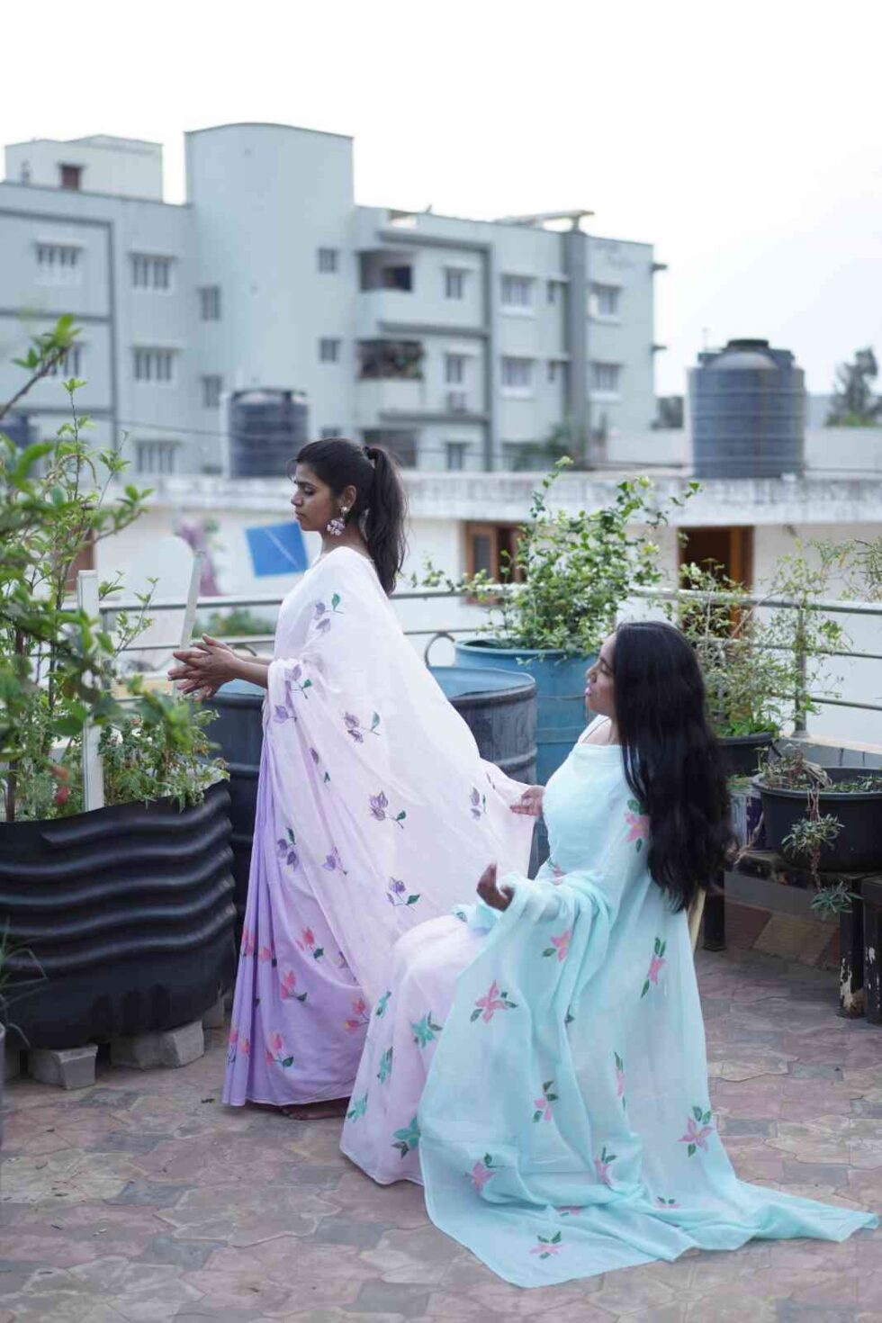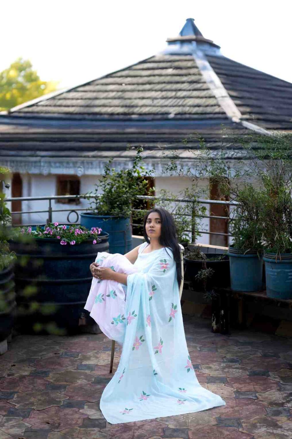 This super soft mul cotton saree is dip-dyed in dual colors – pink & blue. It is hand painted with bright pink & blue 4-petal flowers. Perfect to keep your body cool for long summer days.