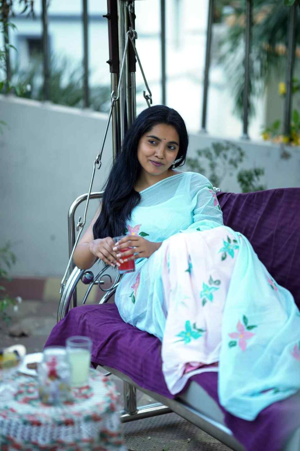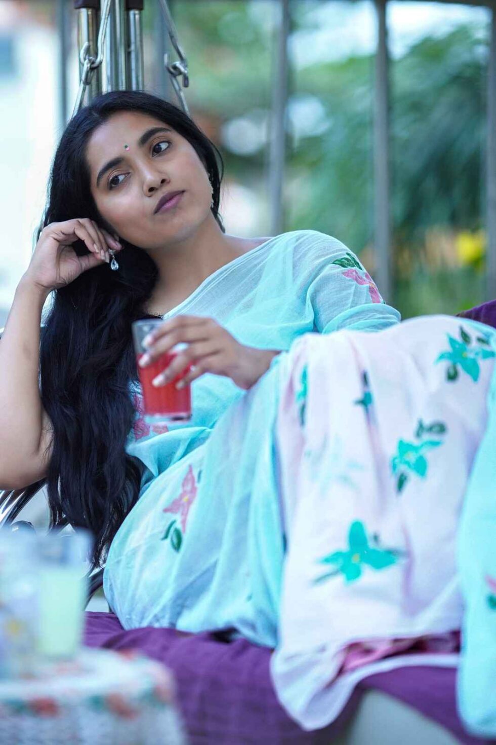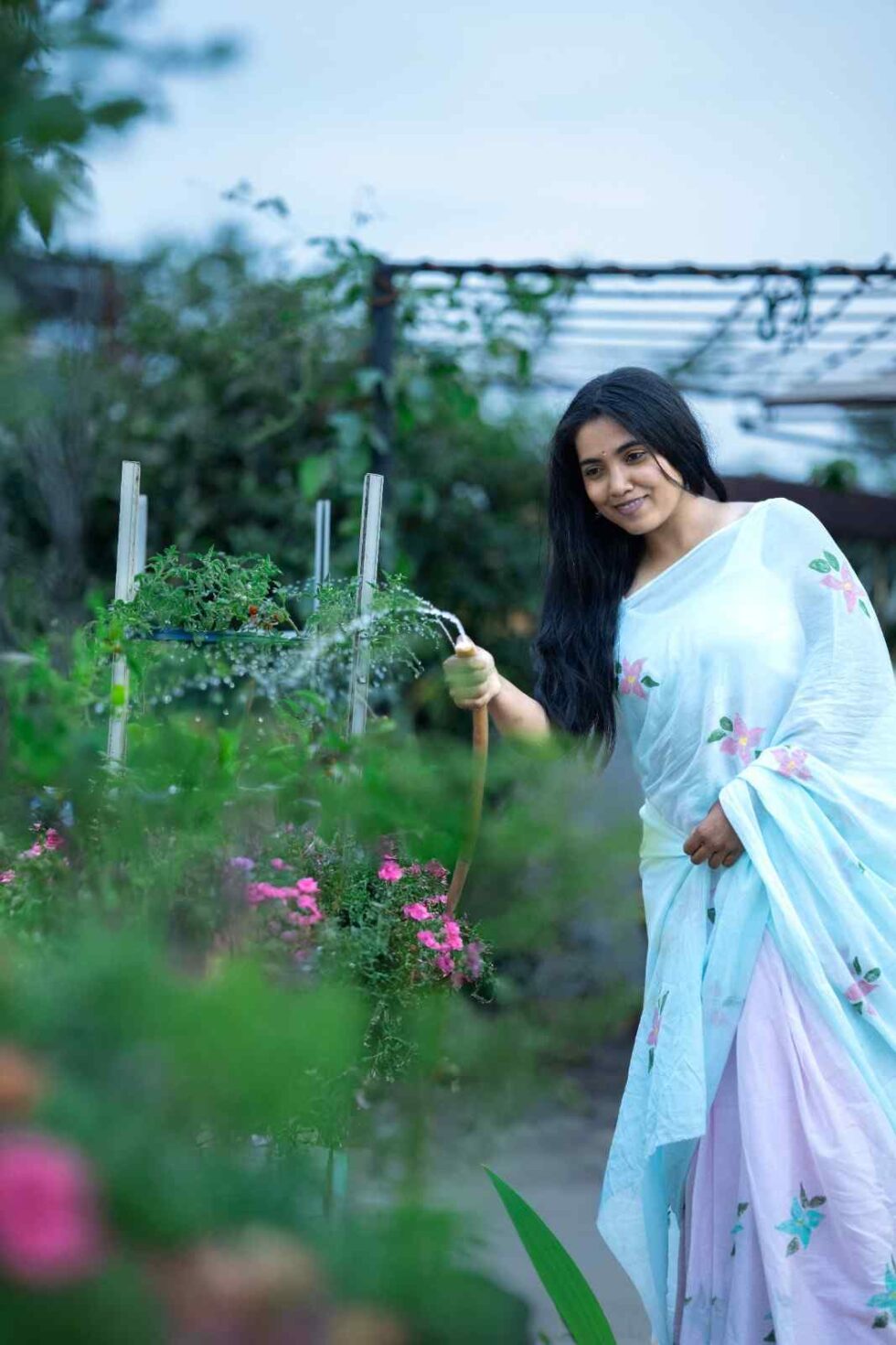 This super soft mul cotton saree is dip-dyed in dual colors – pink & blue. It is hand painted with bright pink & blue 4-petal flowers. Perfect to keep your body cool for long summer days.