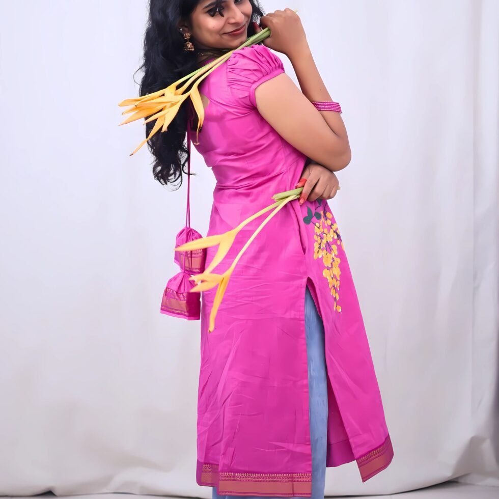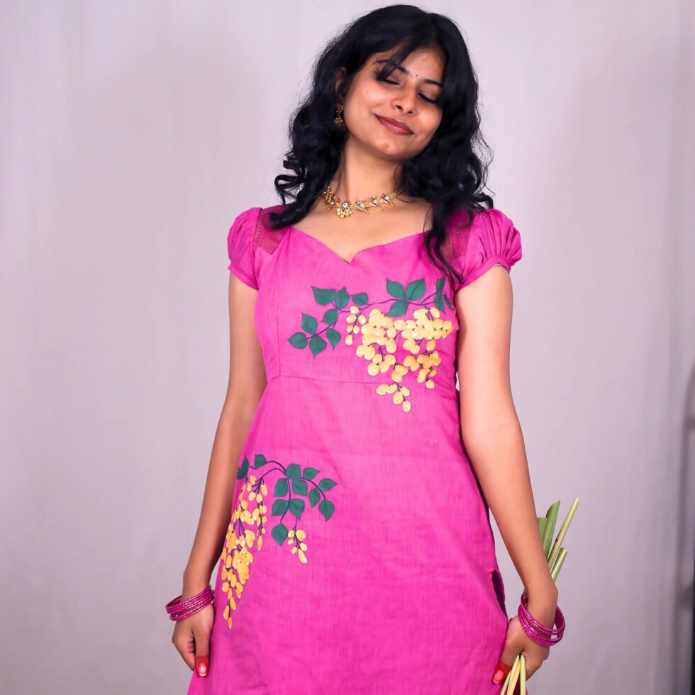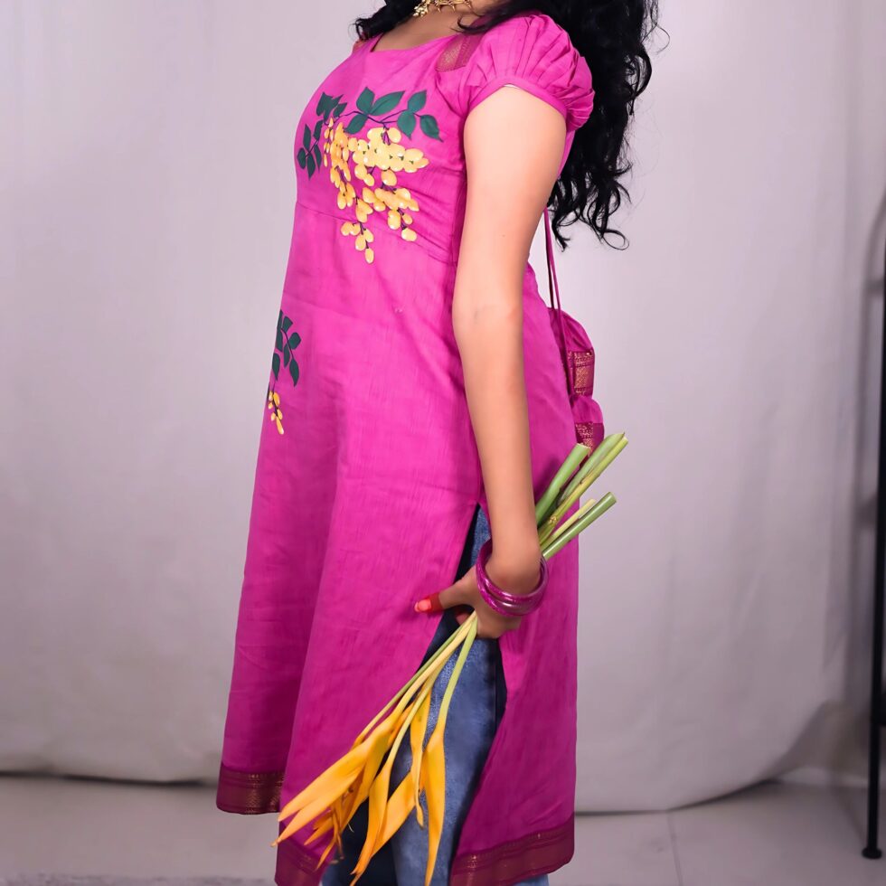 This bright pink long kurti comes with the most feminine sweet heart neck line in the front and a triangular tie up in the back. The princess seam hugs your curves and the yellow wisterias pop on the pretty pink! The top comes with a cotton lining.
