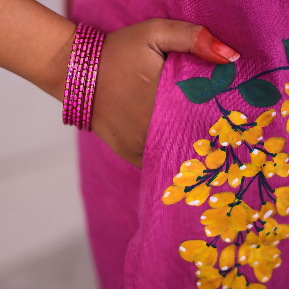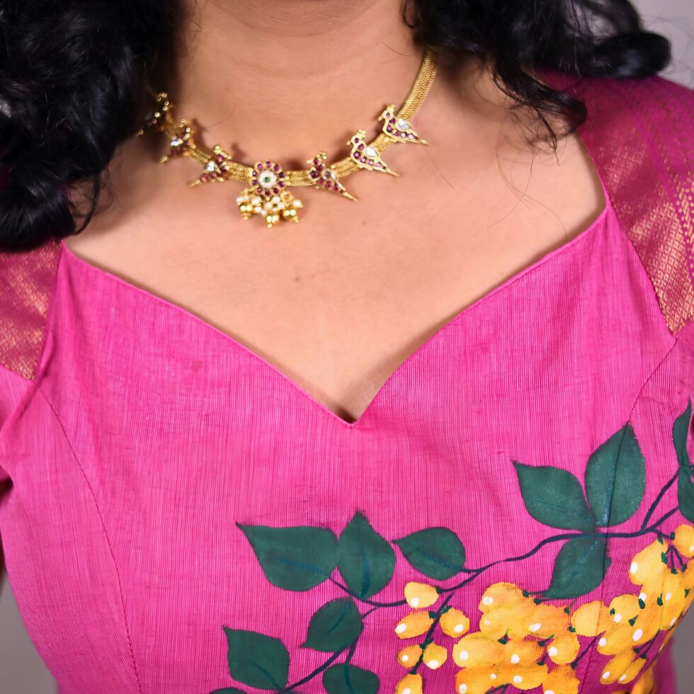 Katha – “Butta bomma” a word that describes Telugu femininity like no other. That is exactly how this piece started to take shape. The puff sleeves are such a significant part of all my childhood “pattu langas” and the innocent charm these sleeves exude just warms my heart. Inspired from the classic saree blouse pattern we hope this brings as much joy that we put into making it.