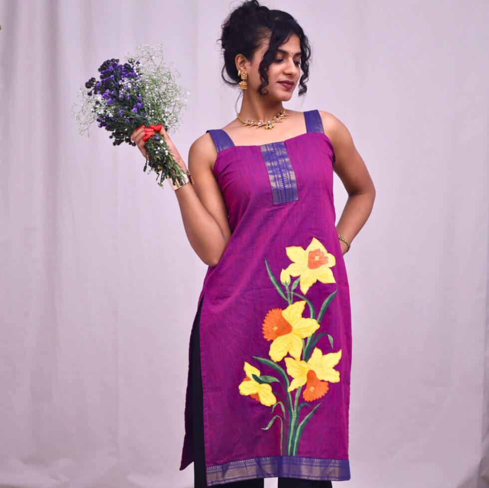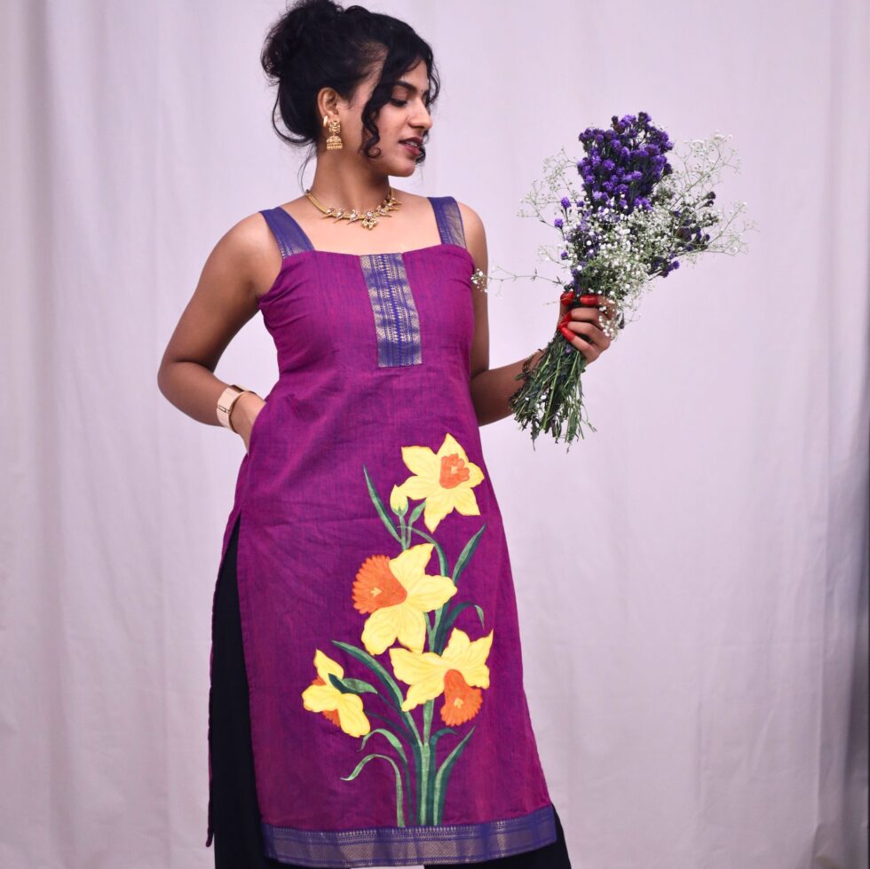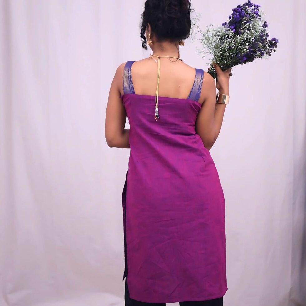 This byzantine purple mangalgiri long kurti comes with supportive straps that thin as they climb up the shoulders. The top comes with a curved square neck line in the front and the back with a zipper and a pocket at the sides. The top comes with a cotton lining.