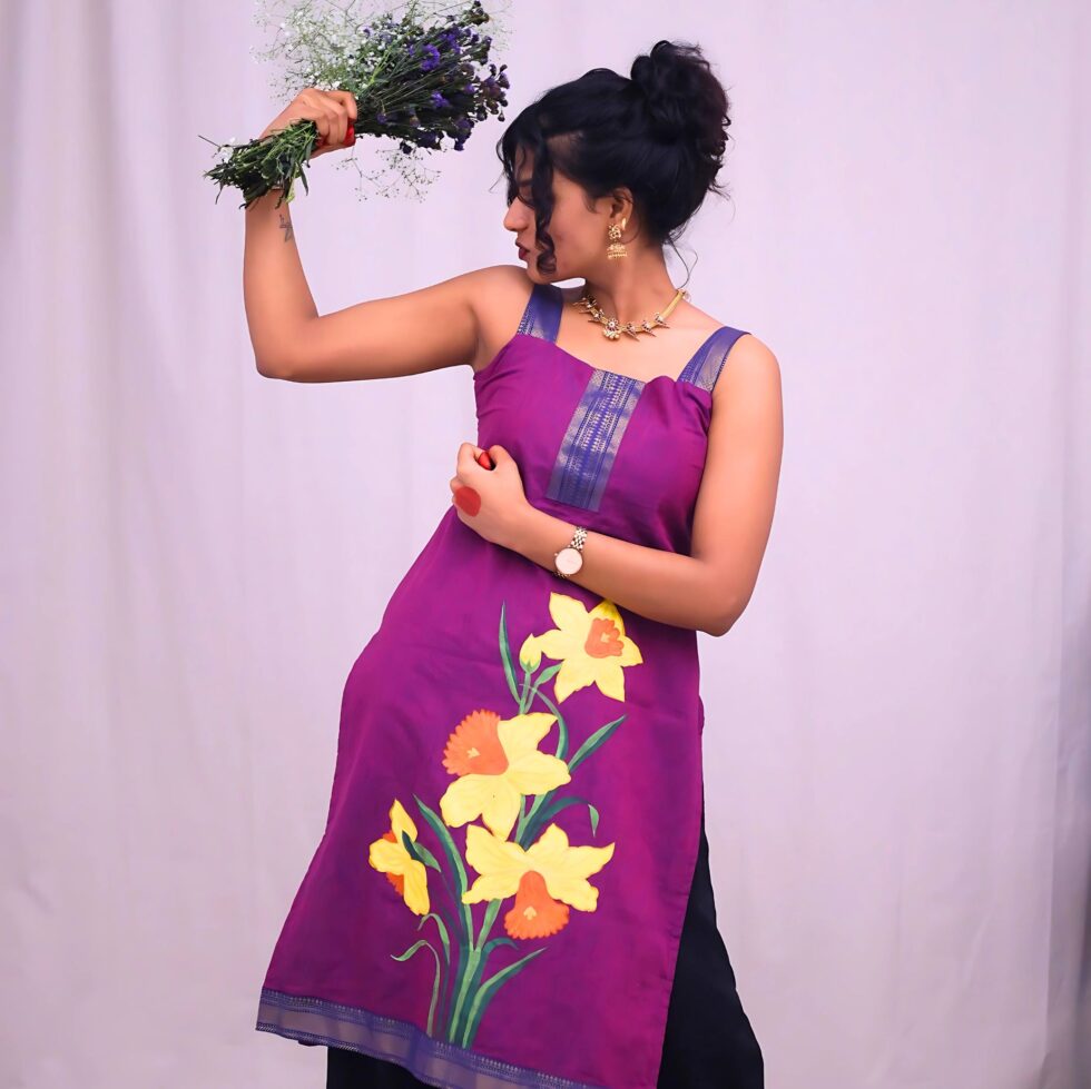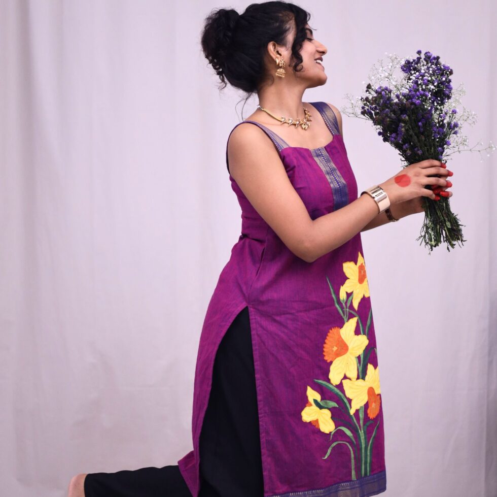 Katha – I have always been obsessed with these daffodils since I saw them first at 11 years old on the cartoon show “The Mickey mouse club house”. The motif came from a place of childhood memories ringing in my ears every now and then. The top itself is a simple nod to our love for the 90s.