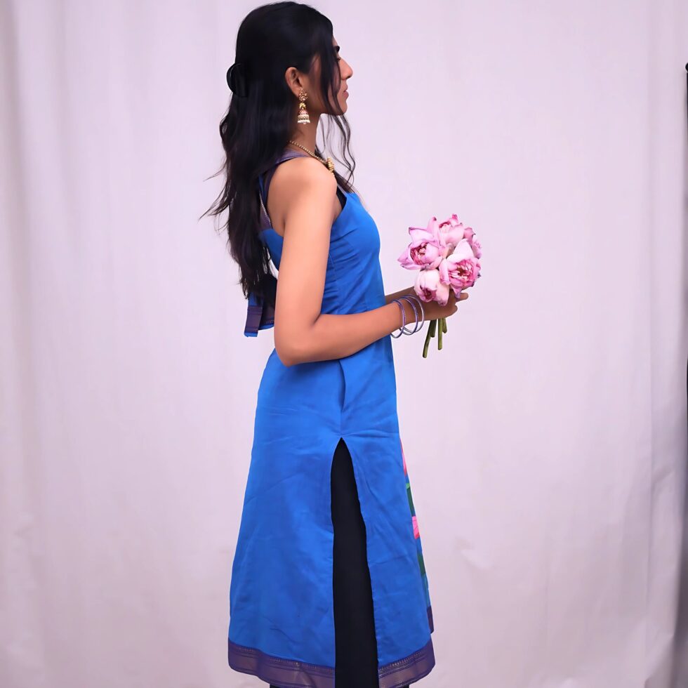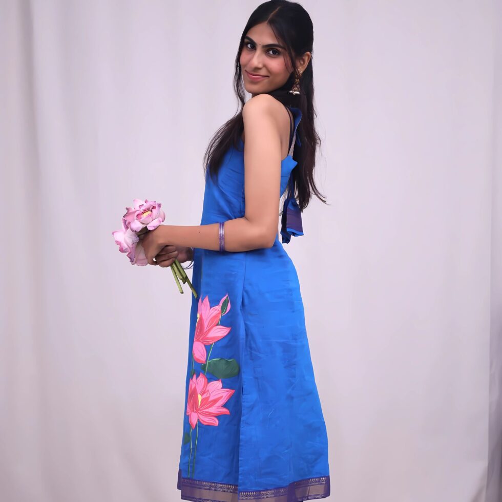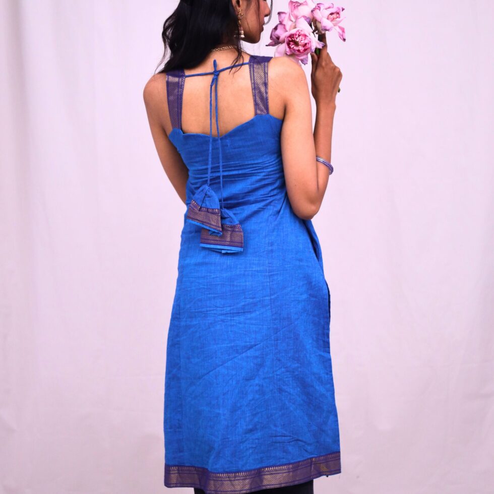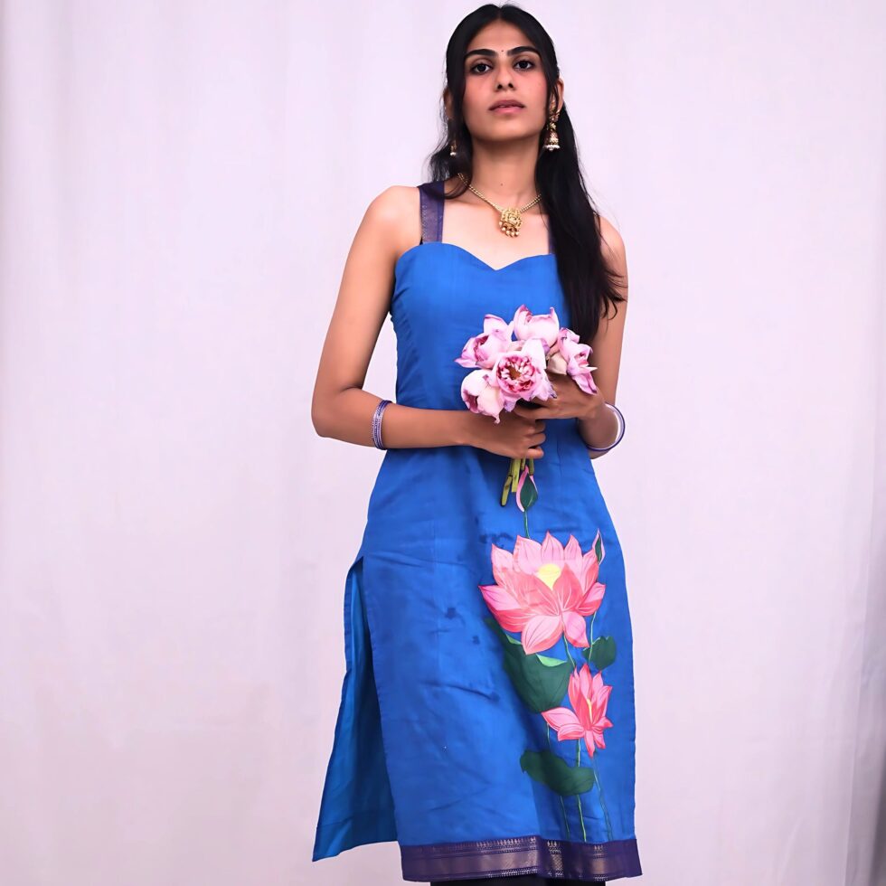 This Cobalt blue mangalgiri long kurti is handpainted with a beautiful lotus motif and a sweetheart neckline both in the front & back. This top comes with a princess line seam all along to contour your curves even more & the pocket adds to the practicality of it. The neck line in the back comes with long tassels. The top comes with a cotton lining.